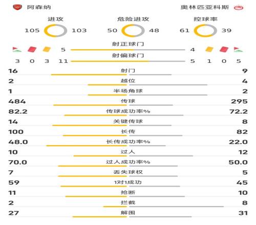 控球率方面,阿森纳达61%,反观奥林匹亚科斯则为39%。传球数据方面,阿森纳全场484次传球,传球成功率达到82.2%;奥林匹亚科斯全场295次传球,传球成功率72.2%。