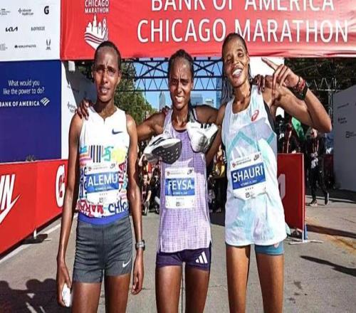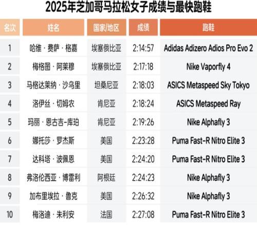 2025年芝加哥马拉松女子领奖台选手及其跑鞋包括:哈维·费萨·格嘉穿着Adidas Adizero Adios Pro Evo 2,梅格图·阿莱穆应该穿着Nike Vaporfly 4,马格达莱纳·沙乌里穿着ASICS Metaspeed Sky Tokyo。