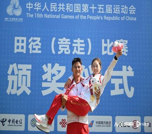特写十五运会上,“三连冠”后的“公主抱”