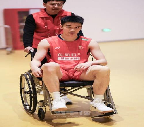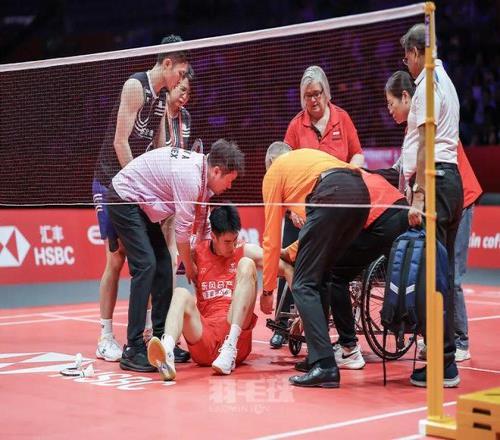 今天上午最后进行的是男单B组李诗沣和周天成的比赛,这场比赛无关出线,是小组第三的争夺。李诗沣在21比14先胜一局、第二局14比11领先时因脚踝受伤弃权,坐轮椅离场。离场时他简短地回应伤情,他表示自己感觉不是太严重,回去要好好冰敷处理并休息一段时间。