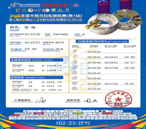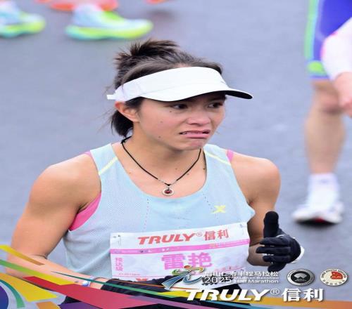 不过,雷艳真正开始接受专业训练还要等到进入遵义师范学院后。体育成绩出众的她参加了大一的校园接力跑,被教练看中,加入了校中长跑队。最初是场地赛,从大二下半年起,开始练习路跑。2024年,雷艳先后在榕江、遵义·新蒲、铜仁·梵净山等半马比赛中取得站台表现,其中遵义·新蒲半马夺得冠军。2025年2月,她在仁寿半马跑出了1小时15分20秒的成绩,刷新个人PB。此后,她又参加了遵义红花岗半马、思南环乌江半马、遵义马拉松的半马,均收获亚军。