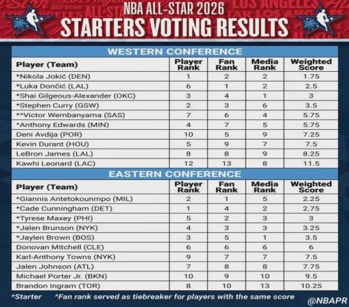 在此之前,詹姆斯连续21年入选全明星首发,却在本届全明星球迷投票仅能位列第八,球员投票同样第八,媒体投票第九;杜兰特球迷投票第九,球员投票第五,媒体投票第七。