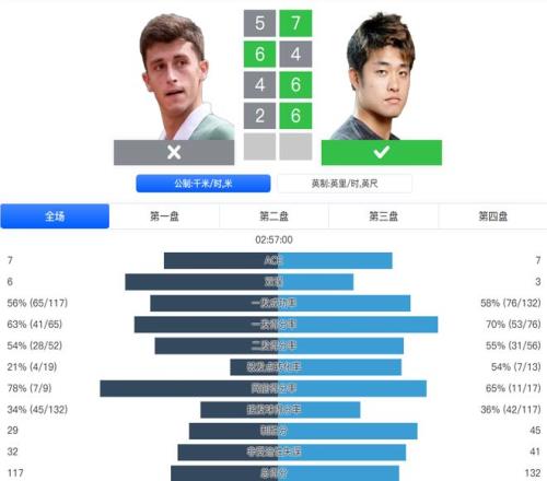 虽然第二盘遇到了一些麻烦,被纳尔迪6比4扳回一盘,但后面两盘阿昺没有给到任何机会,用加起来5次破发的优异表现笑到最后,大比分3比1挺进男单第二轮。