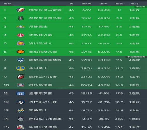 西部其他球队的战绩和排名是雷霆37胜9负,稳居第一,领先身后的球队至少5.5个胜场,榜首不可撼动。马刺31胜14负排在第二,只领先第三名掘金0.5个胜场。处于附加赛区第7-第10的球队分别是森林狼,勇士、开拓者和快船,森林狼遭遇了4连败,今天和勇士的比赛推迟到北京时间周一早上6点30进行。排在最后5名的球队分别是灰熊、独行侠、爵士、国王和鹈鹕。